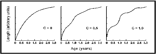 La ecuación (1) tiene dos parámetros más que la CVB estándar: C y ts. C expresa la amplitud de las oscilaciones de crecimiento y es la más facil de interpretar. Cuando C = 0, la ecuación (1) pasa a ser la CVB estándar ; cuando C = 0,5, las oscilaciones estacionales de crecimiento son tales que el crecimiento se incrementa un 50% en el pico de crecimiento del verano, y, brevemente, se reduce un 50% en invierno. Cuando C = 1, el crecimiento se incrementa un 100%, es decir, que se dobla en verano y se hace nulo en invierno (véase Fig. 21).