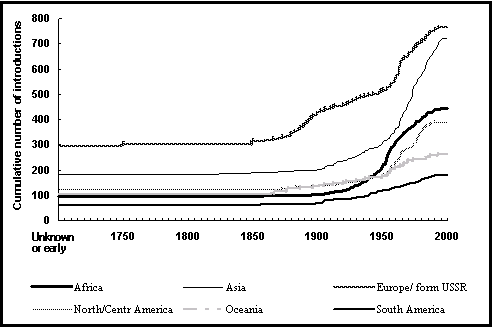 La figura 8 muestra una curva acumulativa del número de introducciones en agua dulce por zona continental FAO y por año. Las introducciones de fecha desconocida han sido contabilizadas con las introducciones anteriores al siglo XVIII, no solamente para mostrar la magnitud de estas introducciones desconocidas, sino también para incluirlas en el recuento total. Como muestra el gráfico, Europa y la ex-URSS suman en conjunto la mayoría de introducciones de peces de agua dulce, y América del Sur la minoría. El gráfico muestra también una aceleración de las introducciones en Asia desde los años 1960 hasta 1980, debido a la expansión de la acuicultura en esta región.