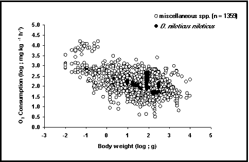 Fig. 45. Consumo relativo de oxígeno en Oreochromis niloticus niloticus comparado con diversas especies. Nótese la pendiente relativamente decreciente de la nube de puntos, y las series verticales de valores obtenidas por los diferentes valores de stress aplicados. |