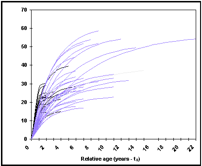 Haga clic sobre el botón ‹ gráfico › Growth curves en la tabla resumen para mostrar las curvas de la longitud en función de la edad relativa (= edad real - t0) (Fig. 17). Esta rutina puede ser usada para reparar en las curvas de crecimiento que se desvían de la tendencia general;