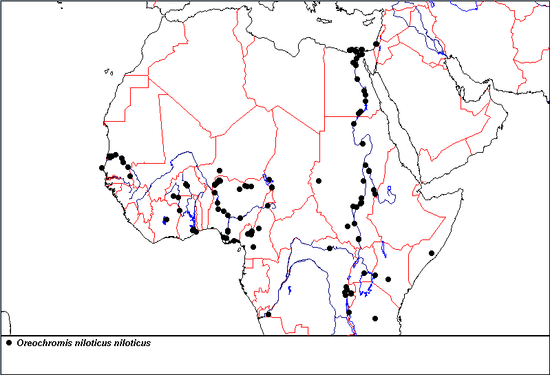 Fig. 57. Mapa de la distribución de Oreochromis niloticus niloticus creado con la opción ‹ Exit & Print ›. Nótese que WinMap se abrió y amplió sobre África del norte y central.