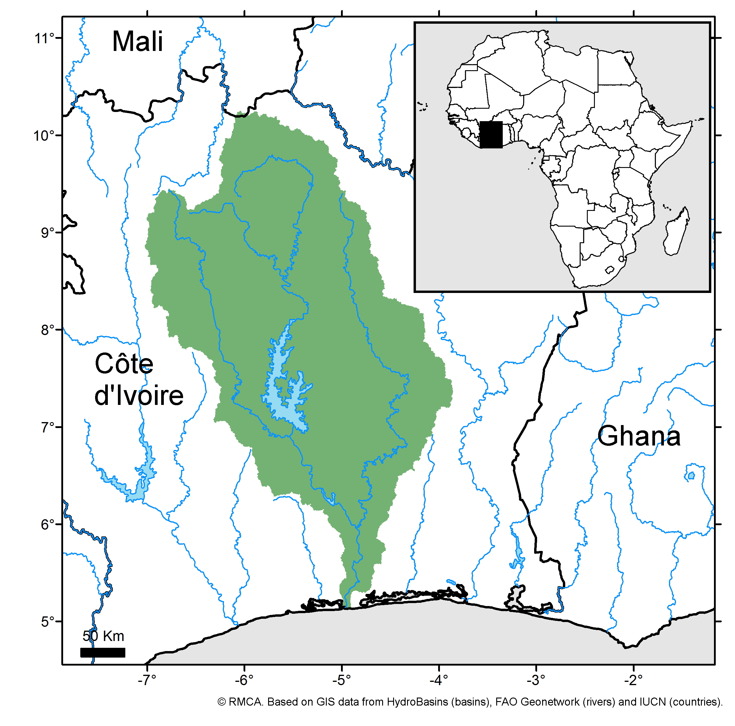 Description | Rises as the White Bandama in the northern highlands and flows southward to enter the Gulf of Guinea and the Tagba Lagoon near Grand Lahou. Its major tributaries are the Red Bandama (Marahoué) and the Nzi. Includes: Lake Kossou | ||||||||||||