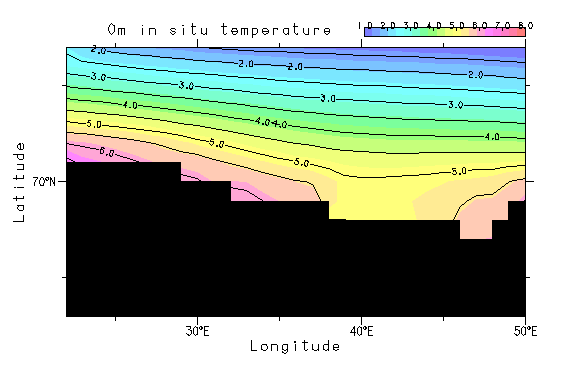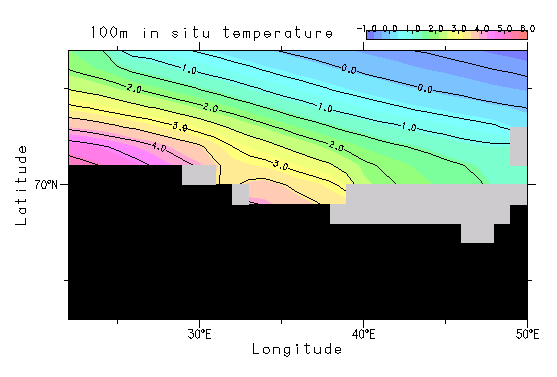 The Barents Sea is located between 70° and 80° N on the North European continental shelf. It covers an area of about 1.4 x 106 km2 and has an average depth of 230 m. There is Atlantic water in the south and west, and Arctic or mixed water in the north and east. The inflowing Atlantic water is cooled and modified into Arctic or Barents Sea water. The Atlantic water is characterized by salinities around 35.0 ppt and temperatures of 2° C or higher. The Arctic water is typically colder than 0° C and has salinities from 34.3 to 34.8 ppt (Loeng, in press). This transformation and exchange of bottom water may cause periodic variations in inflow activity which may explain the large observed variations in ocean climate and ice cover. Freezing over shallow bank areas can result in particularly heavy cold water with salinities above 35.0 ppt. This water flows as bottom water into the deeper basins and trenches (Midttun, 1985). There is also an ice-cover that covers1/3 to 2/3 of the Sea and which varies considerably during the year and inter-annually. The Barents Sea is in many ways an extreme environment, because of the high latitude, large seasonal and annual changes in ocean climate, and the fact that it is an Arctic/subarctic environment (Midttun and Loeng, 1987) (http://www.na.nmfs.gov/lme/text/lme20.htm)