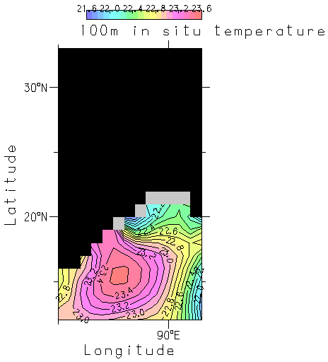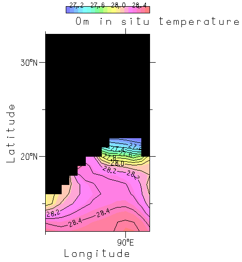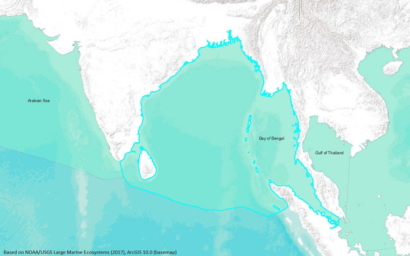 The Bay of Bengal is a tropical ecosystem in a monsoon belt, bounded on the south by the Indian Ocean and surrounded to the north by the Asian continent, with India to the west, Bangladesh to the north, and Burma to the east. Sri Lanka is at the southwestern corner, and Malaysia is at the southeastern. Major rivers drain 200 km3 of water and introduce 12x109 tons of silt during the monsoon season (July through September in India, with similar patterns in Bangladesh and Burma), strongly influencing the dynamics of the ecosystem resulting in silting in harbors and creation of sand bars near river mouths. The surface circulation is characterized by a large cyclonic gyre, influenced by monsoon currents, surrounded by anticyclonic cells influenced by fresh water. (Dwivedi, 1993; Murty et al., 1990) Monsoon waters have a strong influence on the dynamics of the Bay, producing a warm, low-salinity, nutrient-rich, oxygen rich layer to 100 m depth, approximately 1500 km from the northern portion of the Bay where the rivers enter the sea. At depth (200m and 500 m), high salinity, low temperature, low-oxygen waters persist through the year. (Suryanarayana, 1988; Dwivedi, 1993) Upwelling is greatest in the central portion. (Suryanarayana, 1988) Small coastal subsystems include wetlands, mangroves, and backwaters, all important in productivity (http://www.na.nmfs.gov/lme/text/lme34.htm). |