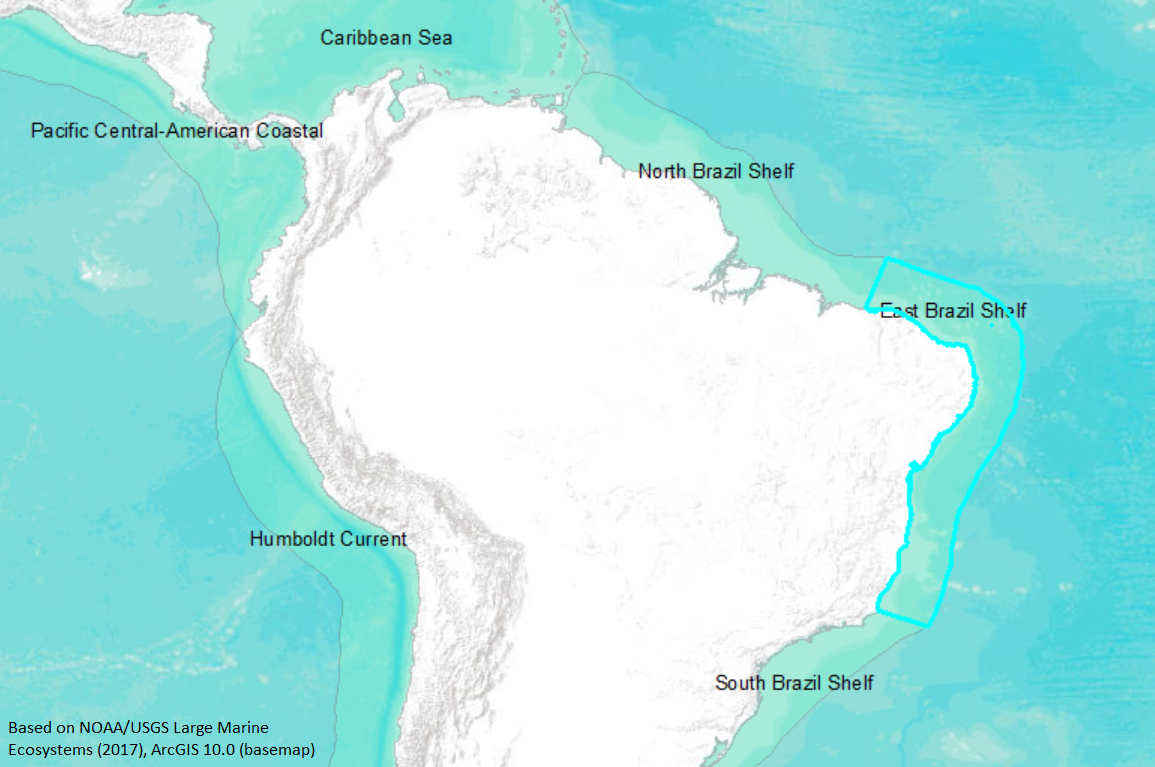 The East Brazil LME is characterised by a narrow shelf, varying from 20 to 50 km and sometimes to 90 km in width, with the exception of the Abrolhos Bank located in the southern portion of the ecosystem. It includes the region from the Parnai'ba estuary in the north to Cape Sao Tome' in the south (http://www.na.nmfs.gov/lme/text/lme16.htm). |