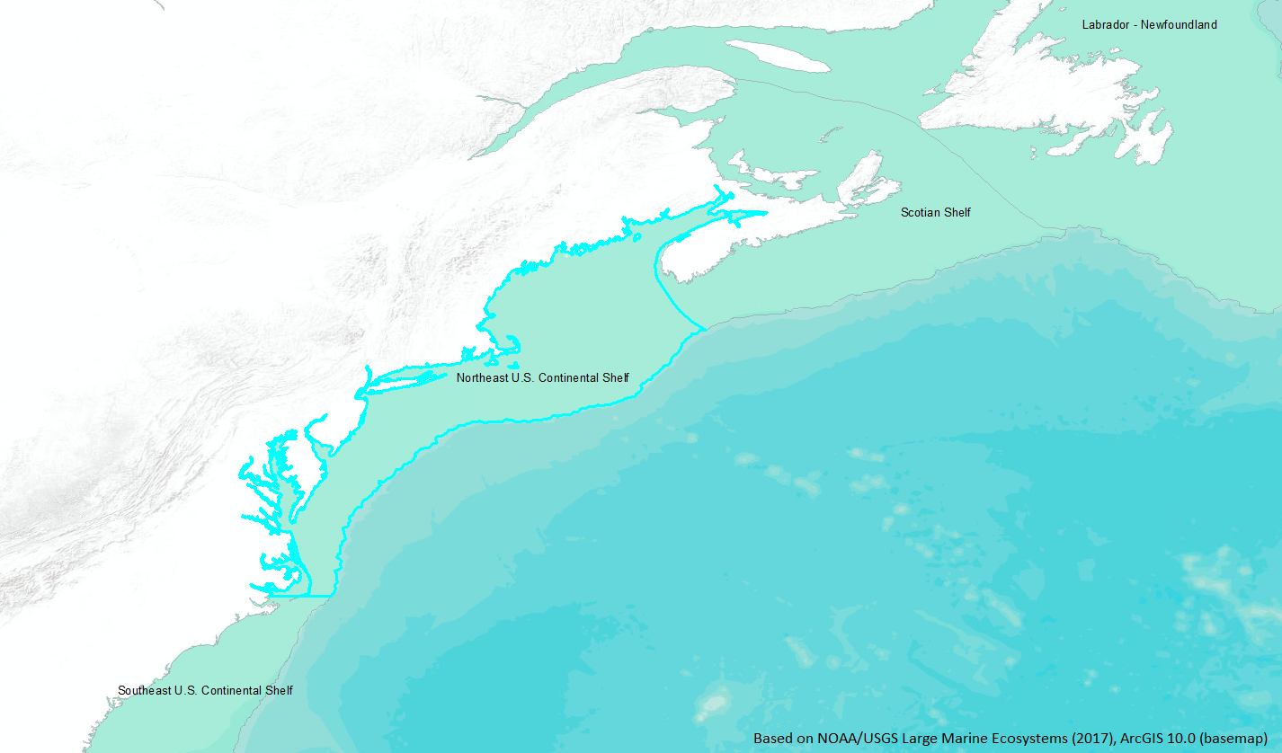 The Northeast Shelf Ecosystem extends from Cape Hatteras to Georges Bank. It is bounded on the east by the Gulf Stream and on the west by the east coast of North America. It encompasses the Slope Sea on the east (waters between the shelf break, at approximately 100 meters, and the inner edge or front of the Gulf Stream), shelf waters in the middle; and coastal and estuarine waters on the west. It is divided into four regions from north to south, including the Gulf of Maine, Georges Bank, Southern New England, and Mid-Atlantic Bight. (Sherman et al., 1996a) Each subarea is characterized by distinct bathymetry and circulation. (Sherman et al., 1996a) The region is influenced by winds, climate changes, river runoff, estuarine exchange, tides, and Gulf Stream meanders and rings, producing a complex circulation regime. (Brooks, 1996). Biota found in the region range from estuarine and coastal species to large pelagic predators, whose range includes the Slope Sea on the east. (Smith et al., 1996). Strong temperature gradients from north to south influence species occurrences. (Sherman et al., 1996a) The LME is a highly productive region and is facing pressures from overfishing, land-based inputs of nutrients and toxic materials, and mineral exploration (http://www.na.nmfs.gov/lme/text/lme7.htm).