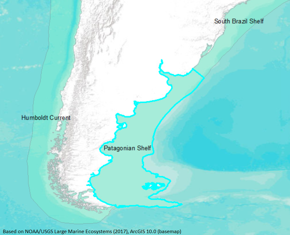 This area contains one of the most extensive continental shelves in the world, which is influenced by narrow, intense western boundary currents. The southward-flowing Brazil Current dominates the northern part of the region while the northward-flowing Falkland Current dominates the southern part, both of which are confined to the shelf break and seaward. (Bakun, 1993) Most of this region is influenced by onshore wind transport, except off Cabo Frio at the extreme north of the region, where a seasonal, locally wind-driven upwelling regime exists Processes of enrichment, stability, and retention combine in various configurations to produce favorable reproductive habitat for small, pelagic-spawning clupeoids. (Bakun and Parrish, 1991)