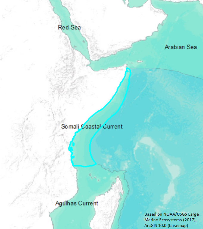 The Somali Current Ecosystem is a biotic region, with a wide variety of subsystems. These include coral reefs, mangroves, seagrass beds, beaches, and estuaries (Okemwa, 1998). It encompasses 700,000 square kilometers (200,000 square nautical miles), and extends 800 km southwest to northeast along the east coast of Africa. It extends from the area near Dar-a-Salaam in the south to just north of the island of Socotra. In the north, it veers sharply to the west with the coastline, and occupies the southern part of the Gulf of Aden, and westward to the vicinity of Bab-el-Mandeb (Alexander, 1998). The adjacent African countries are Yemen, Somalia (in fact, Somalia's coastline represents almost 75% of the total length of the coast bordering the LME), Kenya, and Tanzania; and the islands of Madagascar, Runion, Mayotte, Mauritius, Seychelles, and Comoros. The Somali Current LME has unique bathymetry as a result of major submarine tectonic structures, including the mid-Indian Ridge, the Owen Fracture Zone, and the Carlsberg Ridge (Okemwa, 1998). Its surface circulation is strongly influenced by the seasonal monsoons. From November to April, during the Northeast Monsoon (NEM), the cyclonic gyre moves counterclockwise. During the Southwest Monsoon (SWM) from May to October, the surface gyre moves clockwise. The strongest upwelling off Somalia occurs during the SWM (Baars, Schalk, and Veldhuis, 1998). The rich diversity of many endemic plants and animals are both aesthetically and economically important with tourism and marine wildlife utilization (Okemwa, 1998)