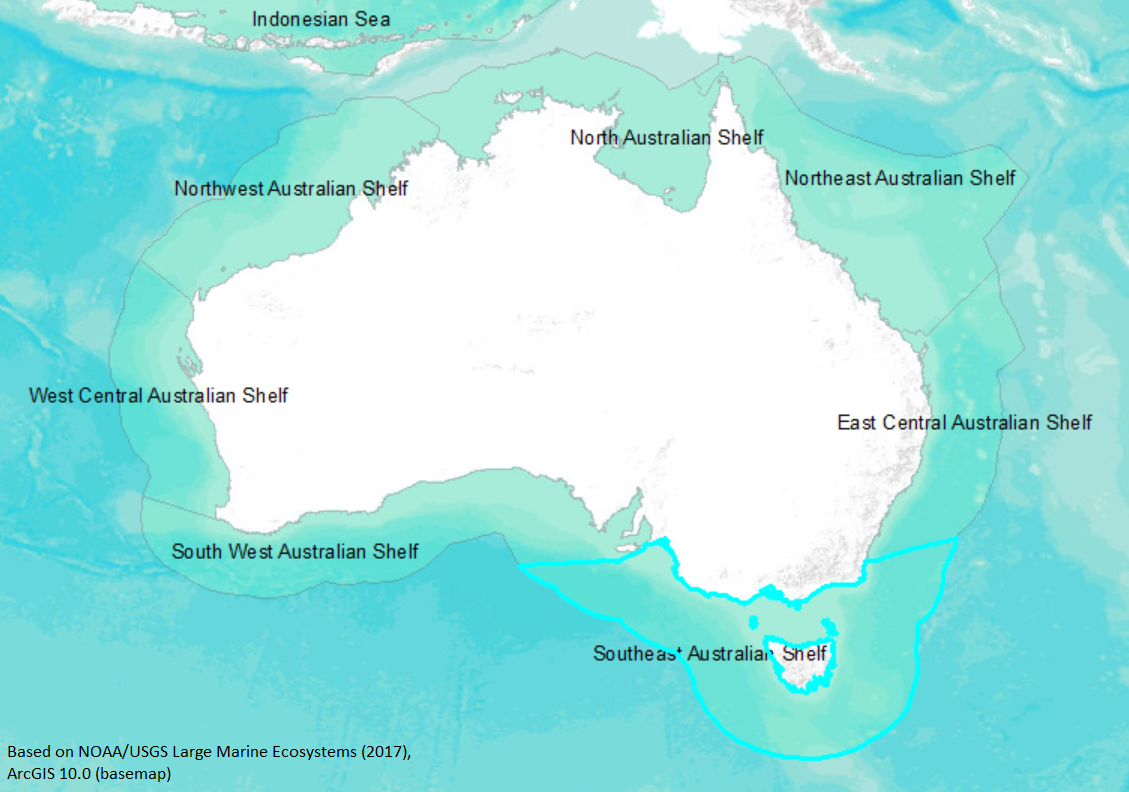 The Southeast Australia Large Marine Ecosystem extends from Cape Howe, at the southern end of the state of New South Wales, to the estuary of the Murray-Darling river system in the State of South Australia. It borders the Southern Ocean and the western boundary currents flowing into the West Wind Drift, which circulates around the continent of Antarctica. It contains the island of Tasmania and the Bass Strait, which separates the island from the Victoria State mainland in the Tasmanian Sea. The LME has a diversity of habitats such as seagrass beds, mud flats, intertidal and sub-tidal rocky reefs, mangrove kelp forests and pelagic systems. The Murray-Darling river system has a large catchment area, and it transports nutrients and sediments from the land into the coastal waters. The climate is temperate (http://na.nefsc.noaa.gov/lme/text/lme42.htm). |