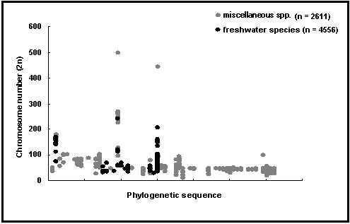 Fig. 56. Chromosome number of freshwater fishes compared with that of miscellaneous species arranged in phylogenetic sequence from primitive (left) to modern (right). Note the decrease in chromosome decrease in chromosome number and variance for modern groups. See Box 34 for a discussion of this graph.
