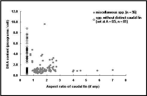 Combining all the above, one can hypothesize that a plot of DNA content vs. the caudal aspect ratio of fish (an index of metabolic intensity, see the SWIMMING table) should have on the left side of the plot a wide range of DNA content associated with low aspect ratios (including aspect ratio set at 0.5, to represent fish which do not use the caudal fin as their main organ of propulsion, and which tend to have low metabolic rates), and, on the right side of the plot, a narrow range of (low) DNA content associated with high aspect ratios. Fig. 58 displays these features, thus corroborating hypotheses linking DNA content¾