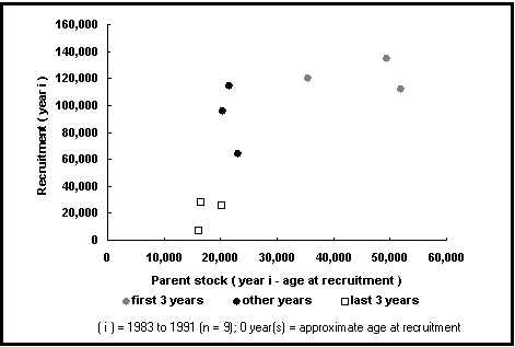 A graph can also be accessed which allows comparing the variability of the available recruitment time series, while another graph (see Fig. 32) illustrates the relationship between parental stock size and subsequent recruitment.