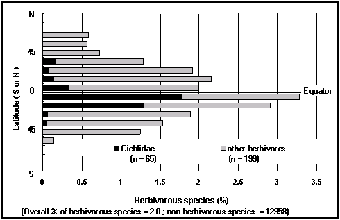 This allowed construction of a FishBase plot of % herbivorous fishes vs. latitude (Fig. 34), i.e., to make accessible in visual form the fact that herbivorous fish species tend to be far more frequent in low than in high latitudes, although their overall percentage among all fishes is small (>1.1%). Both of these phenomena can be explained by the difficulties most fish have in establishing and maintaining, throughout and subsequent to a feeding bout, the low pH levels required for digestion of plant material, especially at low temperatures.