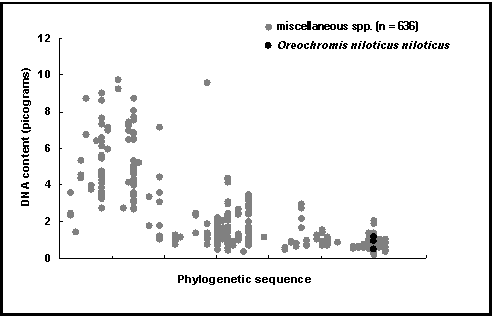 Fig. 57. DNA cell content of Oreochromis niloticus niloticus and miscellaneous species. Note that the decrease in DNA content from primitive (left) to modern groups (right) is similar to the independent decrease in chromosome numbers (Fig. 56).