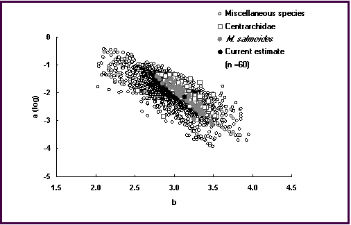 0.001 for eel-like fishes and b > 3 for fishes that increase more in weight than predicted by their increase in length, such as in many morays. While exploring such relationships, we discovered that a plot of log a over b forms a straight line for most species with several length-weight relationships available, such as in Micropterus salmoides (Fig. 18). Estimates that are clearly below or above that line appear to be questionable. We have added an option to that graph where users can enter their estimates of ‘a’ and ‘b’ for the respective species and see how it compares against all other estimates. The graph is also available on the Internet version. We are currently exploring other ramifications of this graph, such as the factors determining the length and the slope of the line formed by the specific dots.