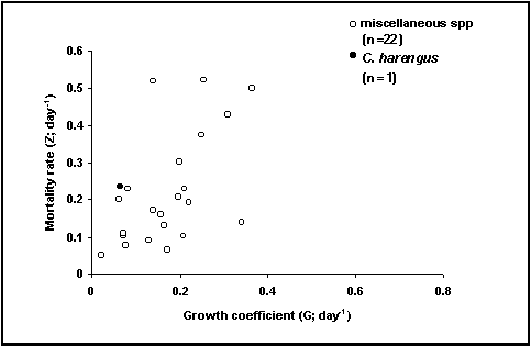 Fig. 48. Relationship between mortality and growth in larvae. Light dots: all data points in FishBase; black dot: record for herring larvae.